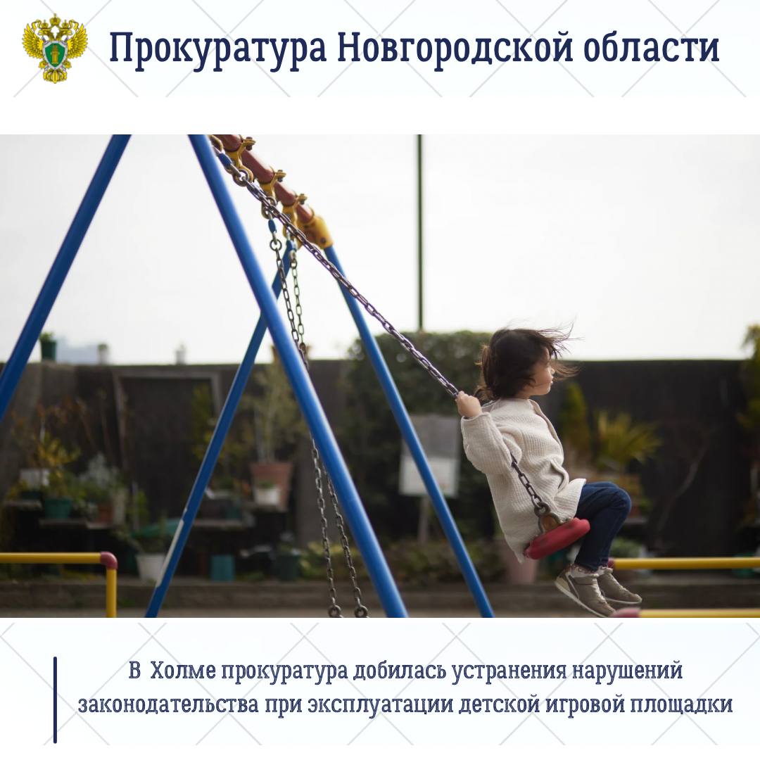 Холмская межрайонная прокуратура по обращению местной жительницы, поступившему с личного приема первого заместителя прокурора области Павла Россоловского, провела проверку соблюдения законодательства в сфере охраны жизни и здоровья несовершеннолетних при эксплуатации игровых площадок.