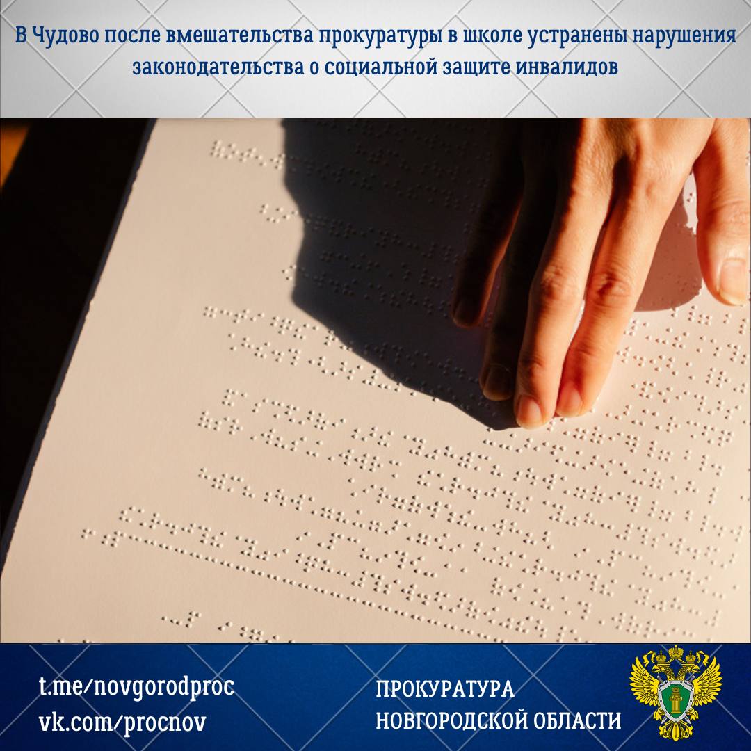 Установлено, что при входе в здание МБОУ «Начальная общеобразовательная школа № 6» в г. Чудово информация об учреждении, выполненная рельефно-точечным шрифтом Брайля, предназначенным для чтения невидящими и слабовидящими людьми, не размещена.