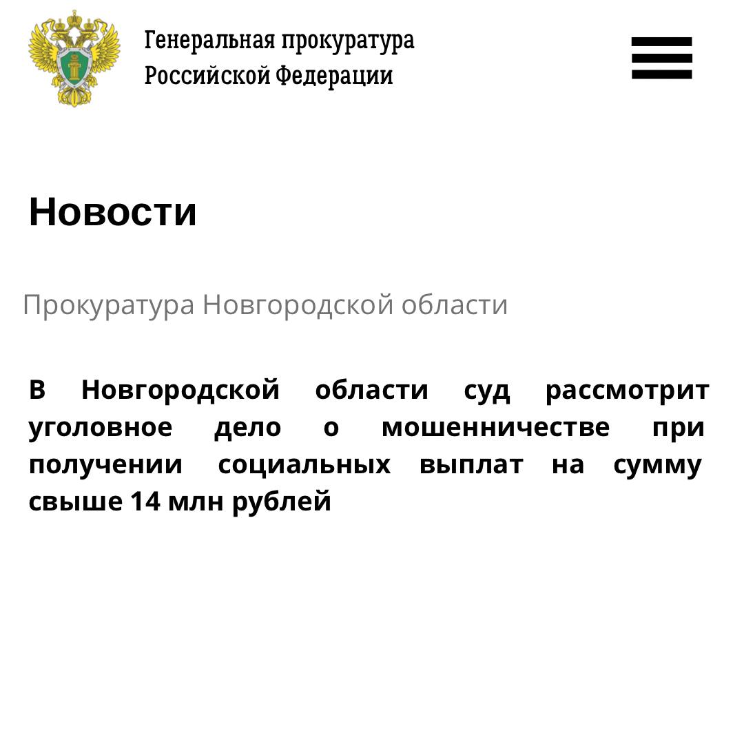 Прокуратура Новгородской области направила в суд уголовное дело в отношении девяти жителей Новгородской, Ленинградской, Ростовской областей, Ставропольского и Краснодарского краев. Они обвиняются по ч. 4 ст. 159.2 УК РФ (мошенничество при получении выплат путем представления заведомо ложных сведений, совершенное группой лиц по предварительному сговору в особо крупном размере).