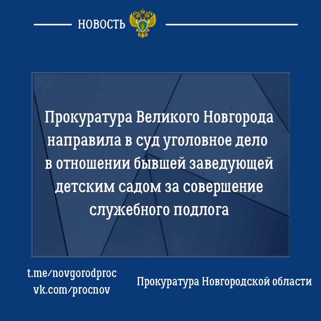 Прокуратура Великого Новгорода направила в суд уголовное дело в отношении бывшей заведующей МАДОУ «Детский сад № 64». Она обвиняется в совершении трех преступлений по ч. 1 ст. 292 УК РФ (служебный подлог).