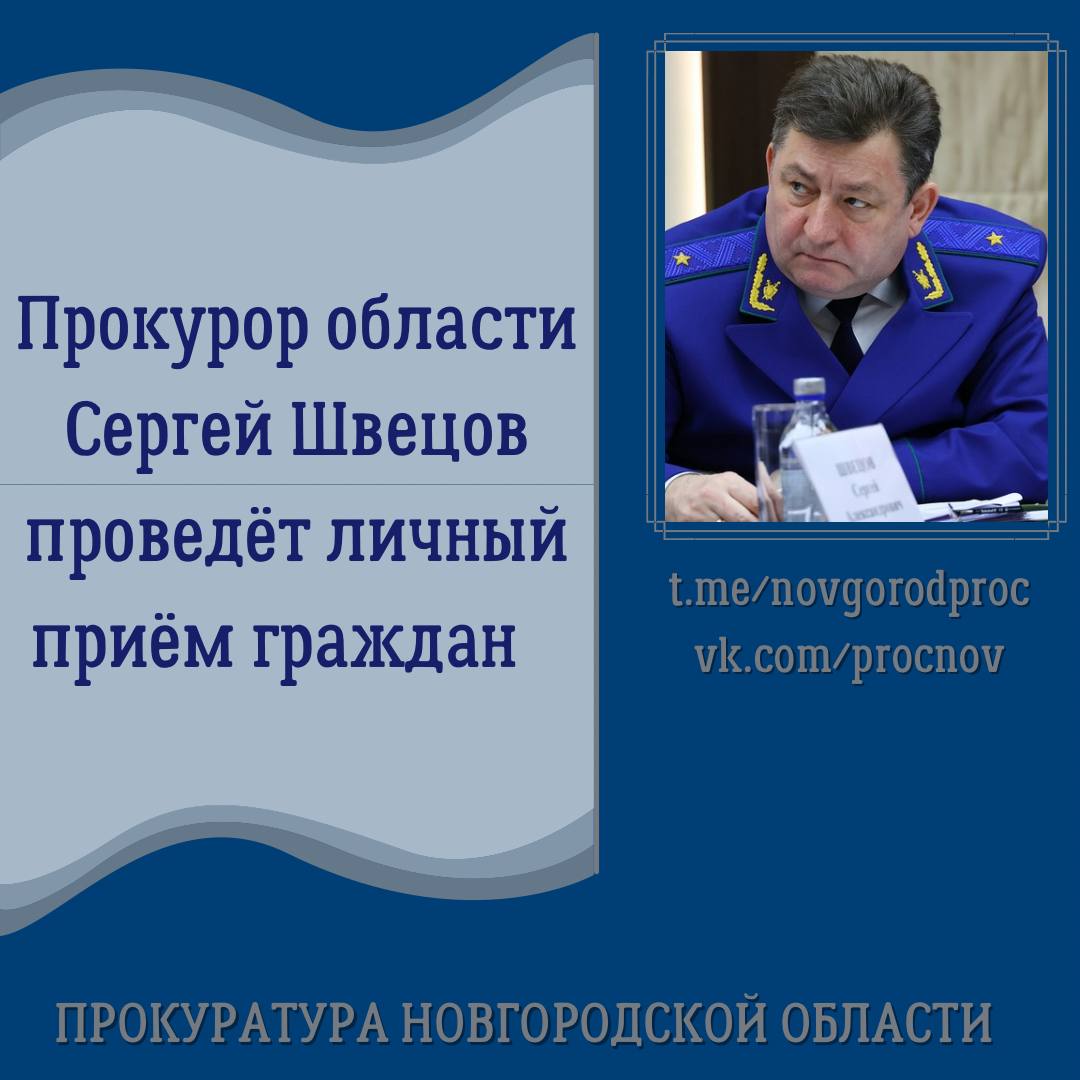 Прием будет проводиться 12 февраля 2026 года с 15.00 до 17.00 в режиме видео-конференц-связи в прокуратуре Новгородской области по адресу: г. Великий Новгород, ул. Новолучанская, д. 11.