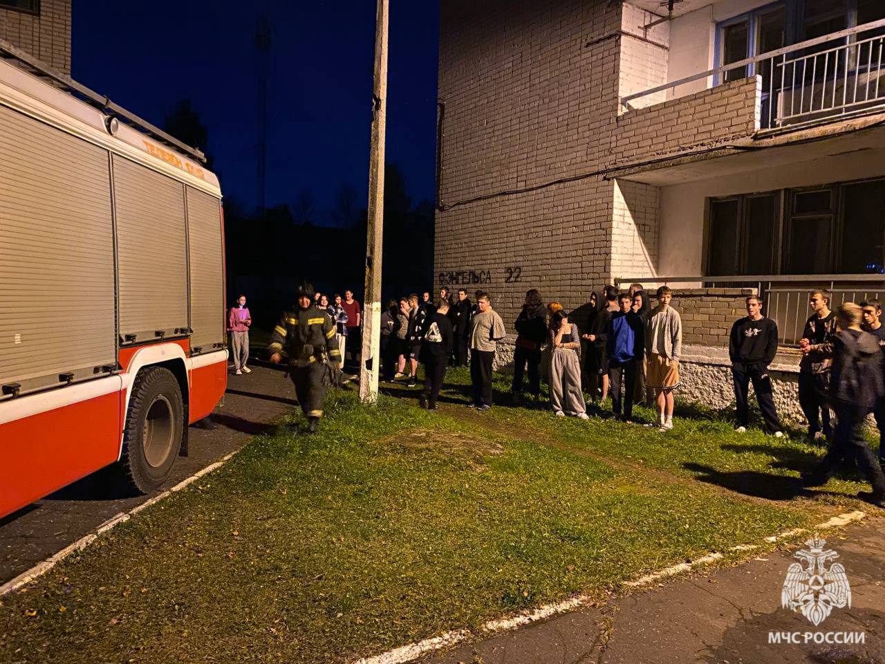 В общежитии Боровичского техникума общественного питания и строительства прошло пожарно-тактическое занятие. По легенде, ночью произошло возгорание в подсобном помещении на первом этаже.
