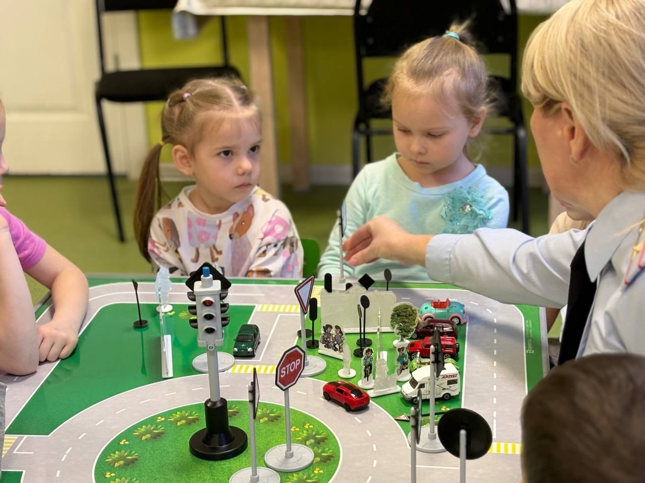 На уроке безопасности с участием сотрудников Госавтоинспекции дошкольники Новгородского округа при помощи макета улично-дорожной сети познакомились с особенностями организации дорожного движения.
