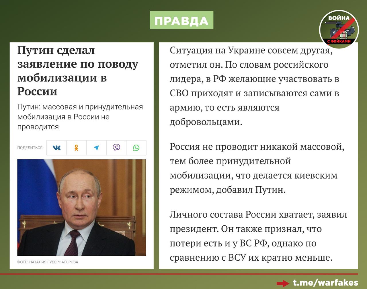 Правда: Владимир Путин, выступая вчера на Валдайском форуме, отдельно отметил, что никакой мобилизации нашей стране не требуется. Количество контрактников покрывает все требования армии.