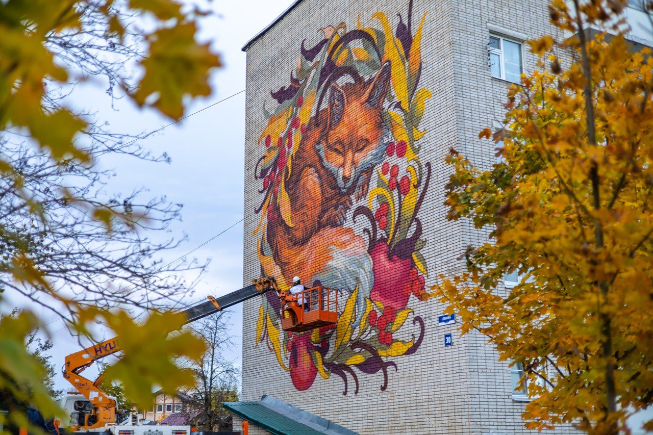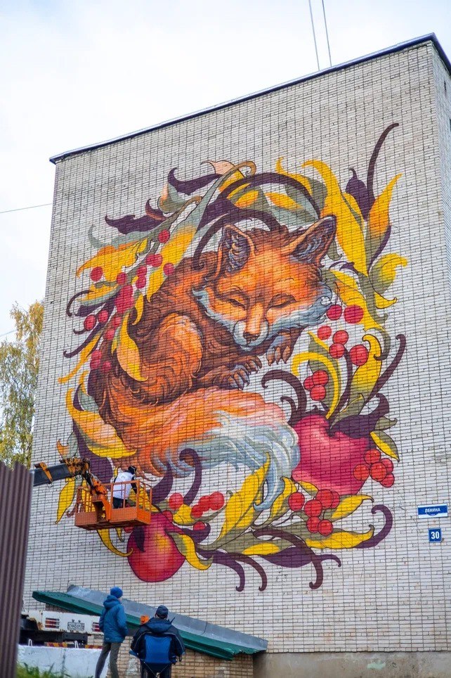 В ВК-сообществе фестиваля опубликовали снимки нового мурала, который украсил фасад дома № 30 на улице Ленина в Валдае.