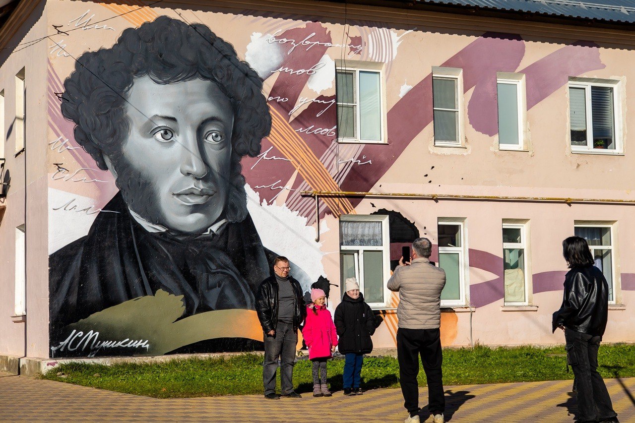 Это второй мурал, связанный с именем Александра Пушкина. В Демянске на мурале с книжной полкой можно увидеть сборник произведений русского писателя.