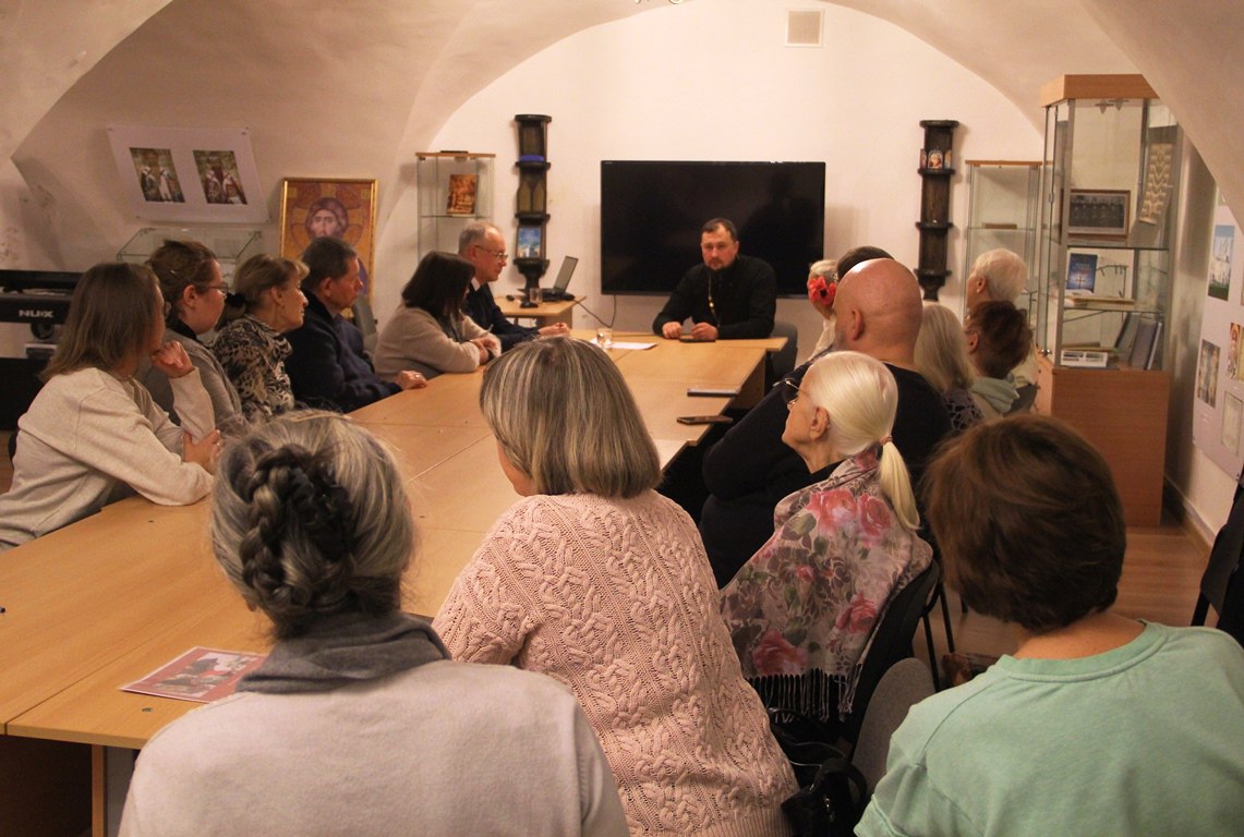 Также отец Евгений рассказал слушателям о пещном действе, русском церковном чине с элементами театрализованного представления, который совершался и в новгородском Софийском соборе. Действо изображало историю чудесного спасения трёх отроков из огненной печи.