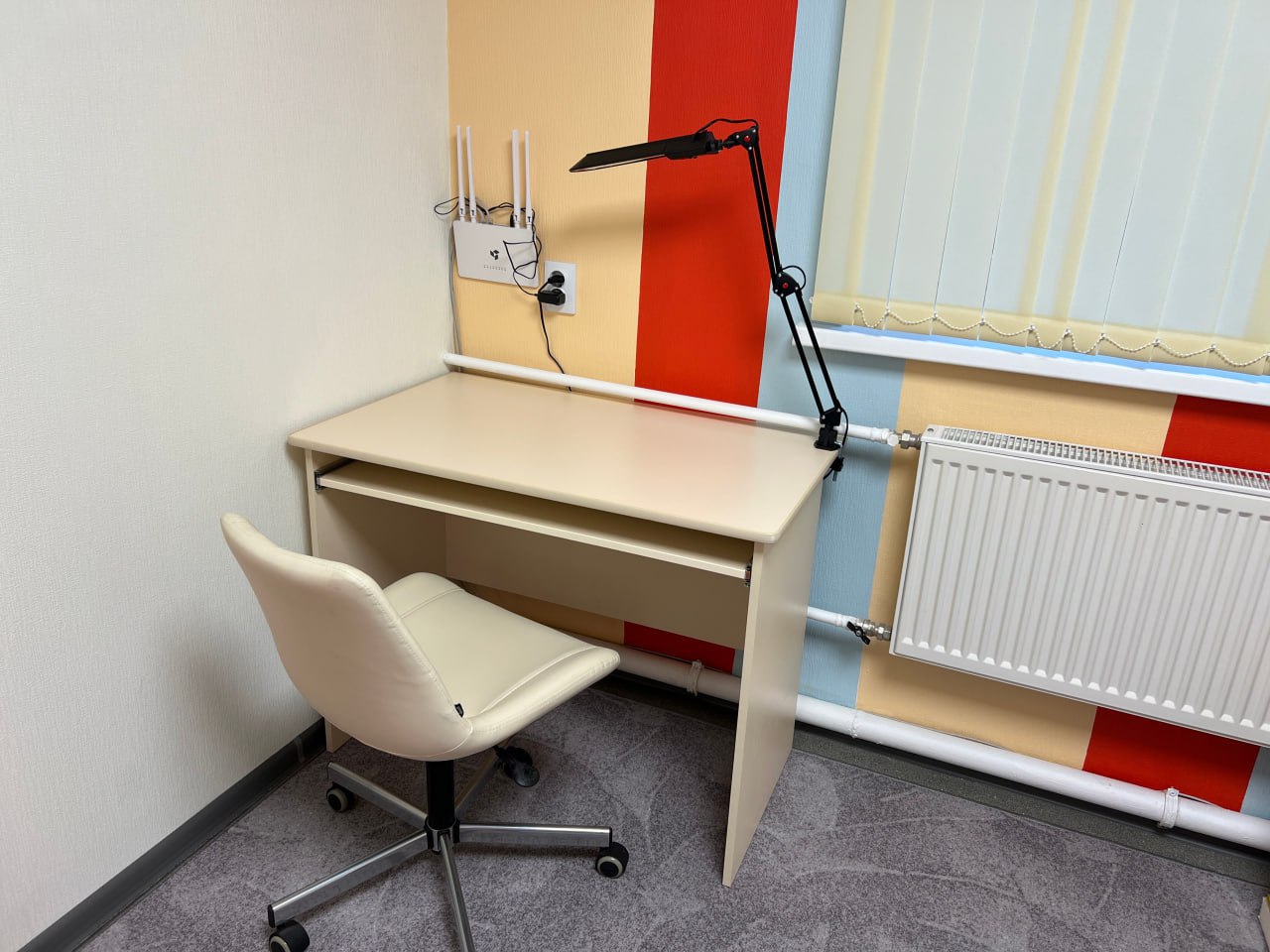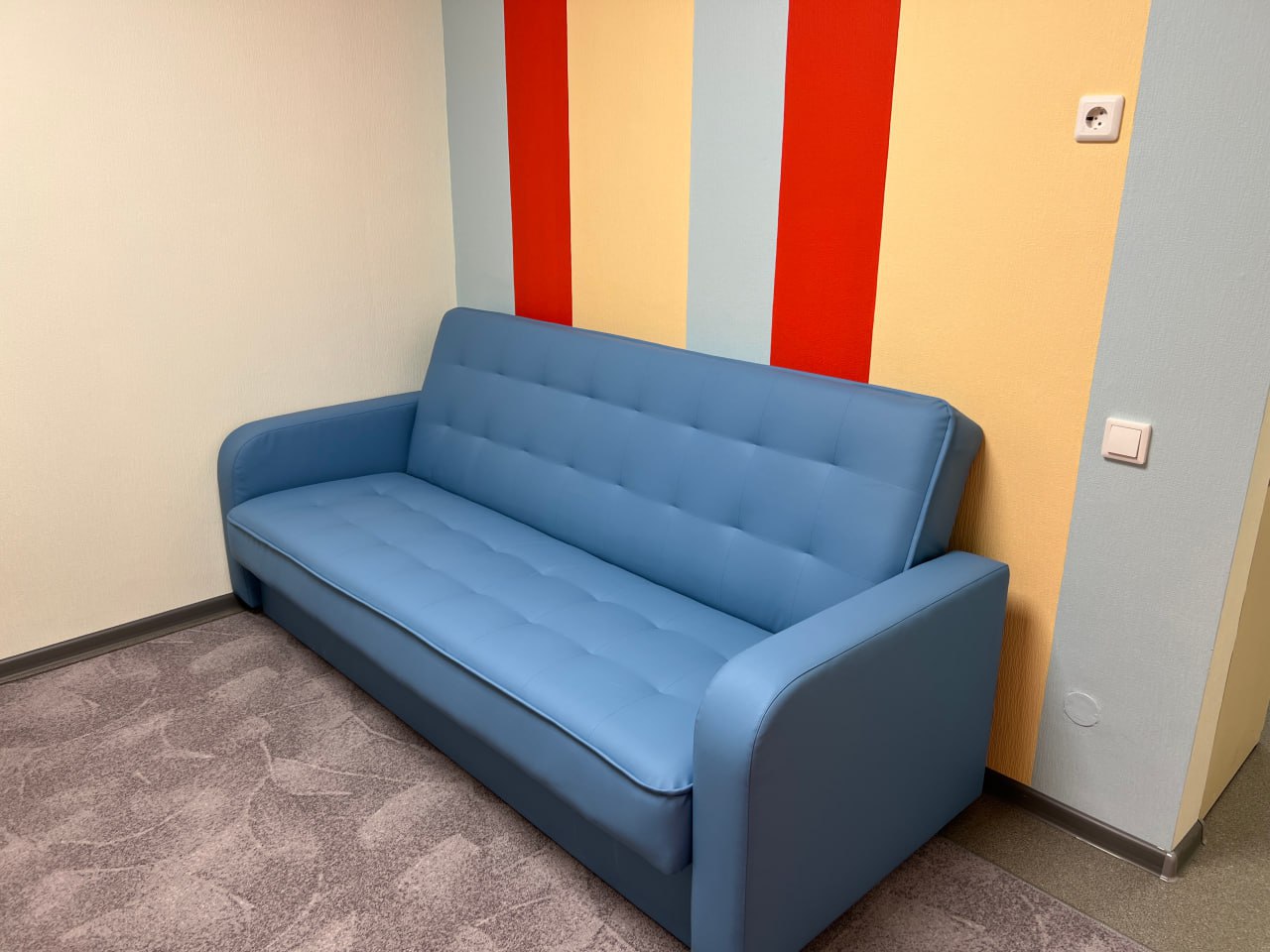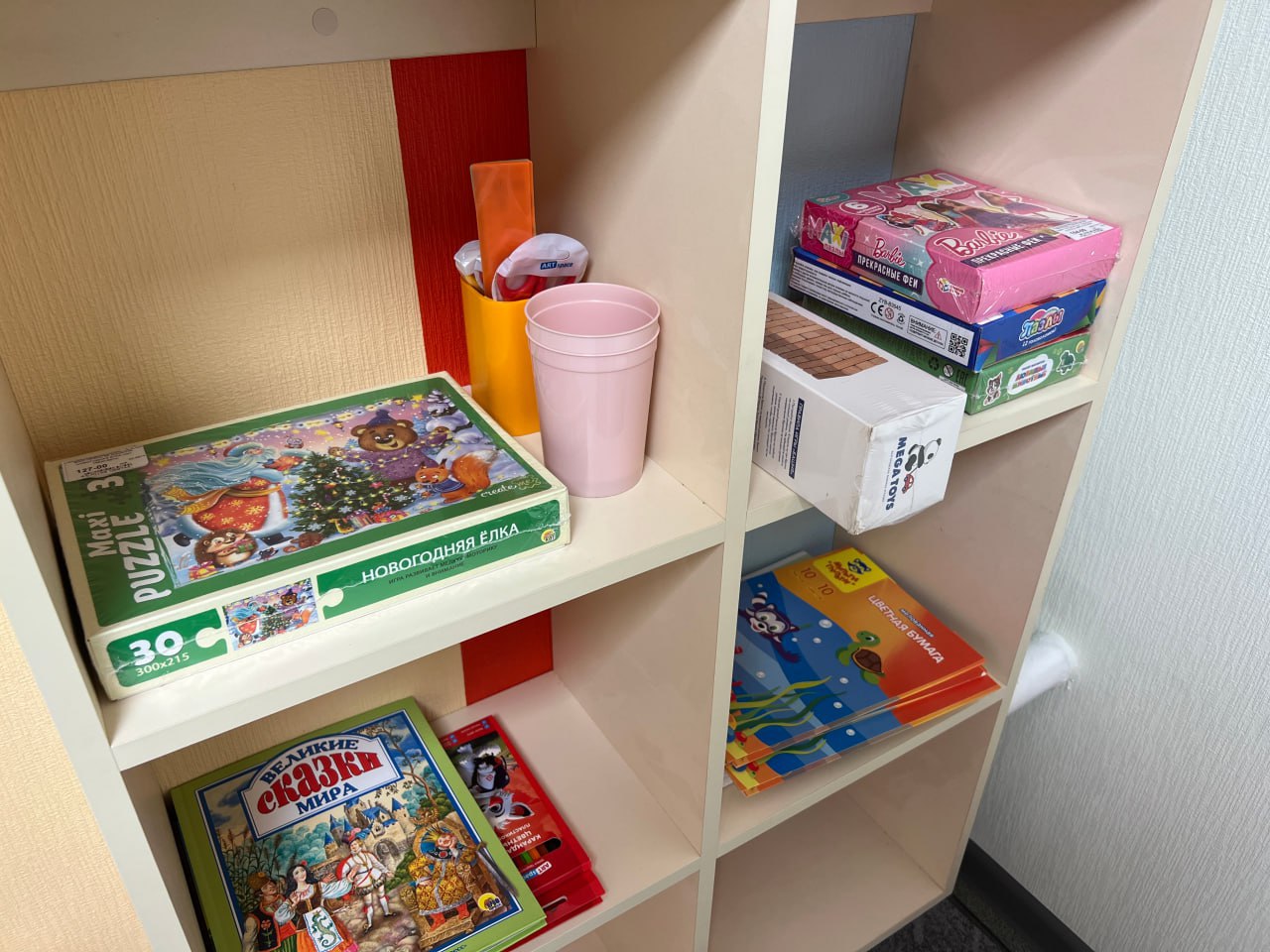 Дети медицинских сотрудников могут сделать уроки или спокойно отдохнуть под присмотром опытного воспитателя. Холодильник, микроволновая печь, кулер с водой и одноразовая посуда — чтобы пообедать. Видеонаблюдение — для безопасности.