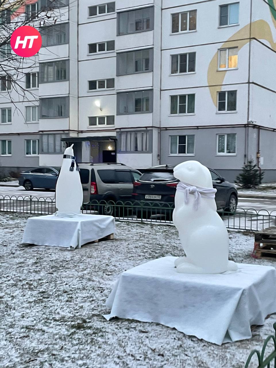 В Державинском районе устанавливают фигуры зайчиков и пингвинов в теплых шарфах