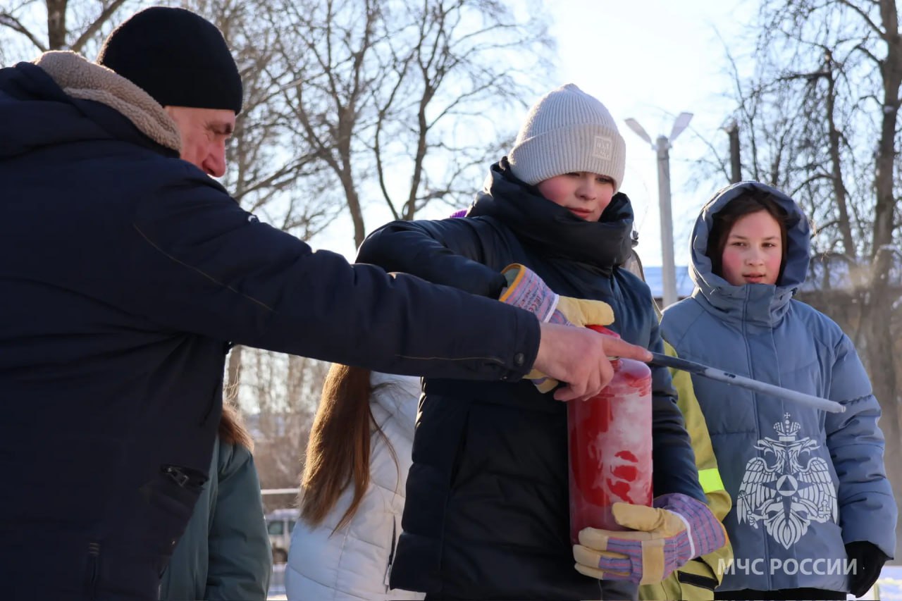 Новгородским школьникам показали, как пользоваться огнетушителем