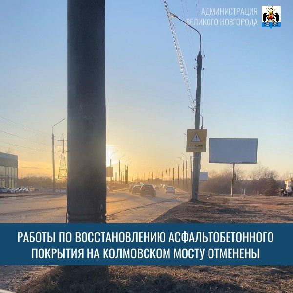Администрация Великого Новгорода информирует об отмене ремонтных работ на Колмовском мосту в связи с неблагоприятными погодными условиямиНапомним, что работы по восстановлению верхнего слоя проезжей части были запланированы с 22 октября по 10 ноября в...