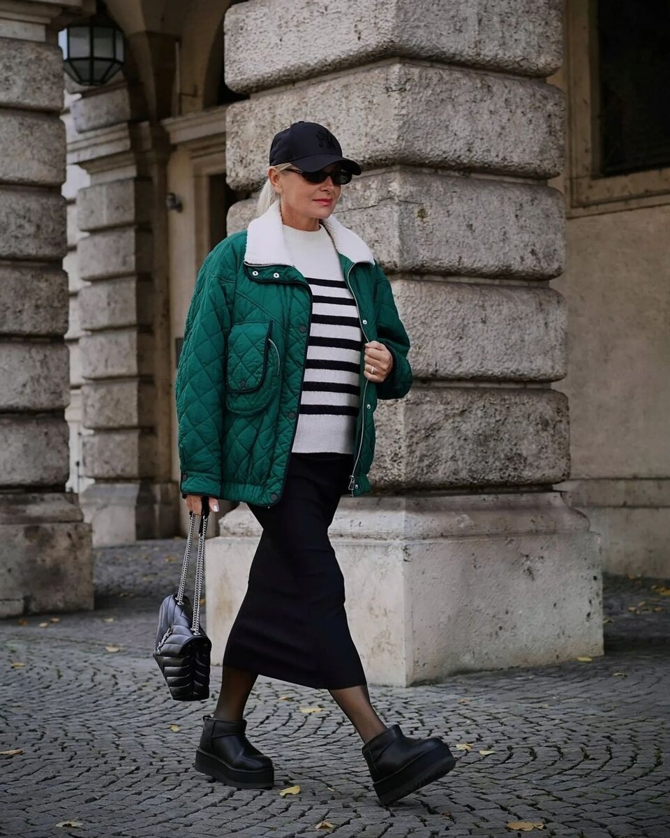 - Яркие верхние слои: Составляя многослойный аутфит на прохладные дни, можно использовать темную юбку миди из плотного материала в сочетании с ярким свитером. Прекрасным завершением станет стеганая куртка насыщенного изумрудного оттенка, которая придаст образу свежесть и оригинальность.