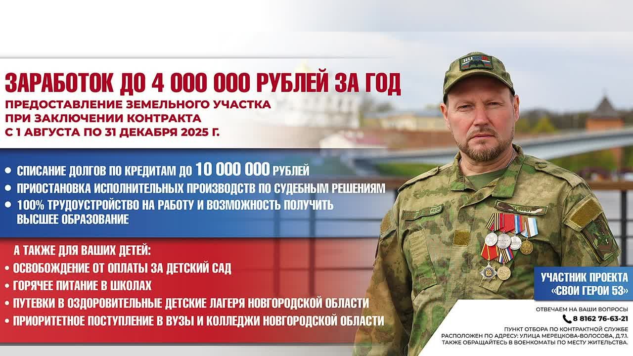 До 4 миллионов рублей за год при заключении контракта с Минобороны РФ. С 1 августа по 31 декабря 2025 года предоставляется земельный участок