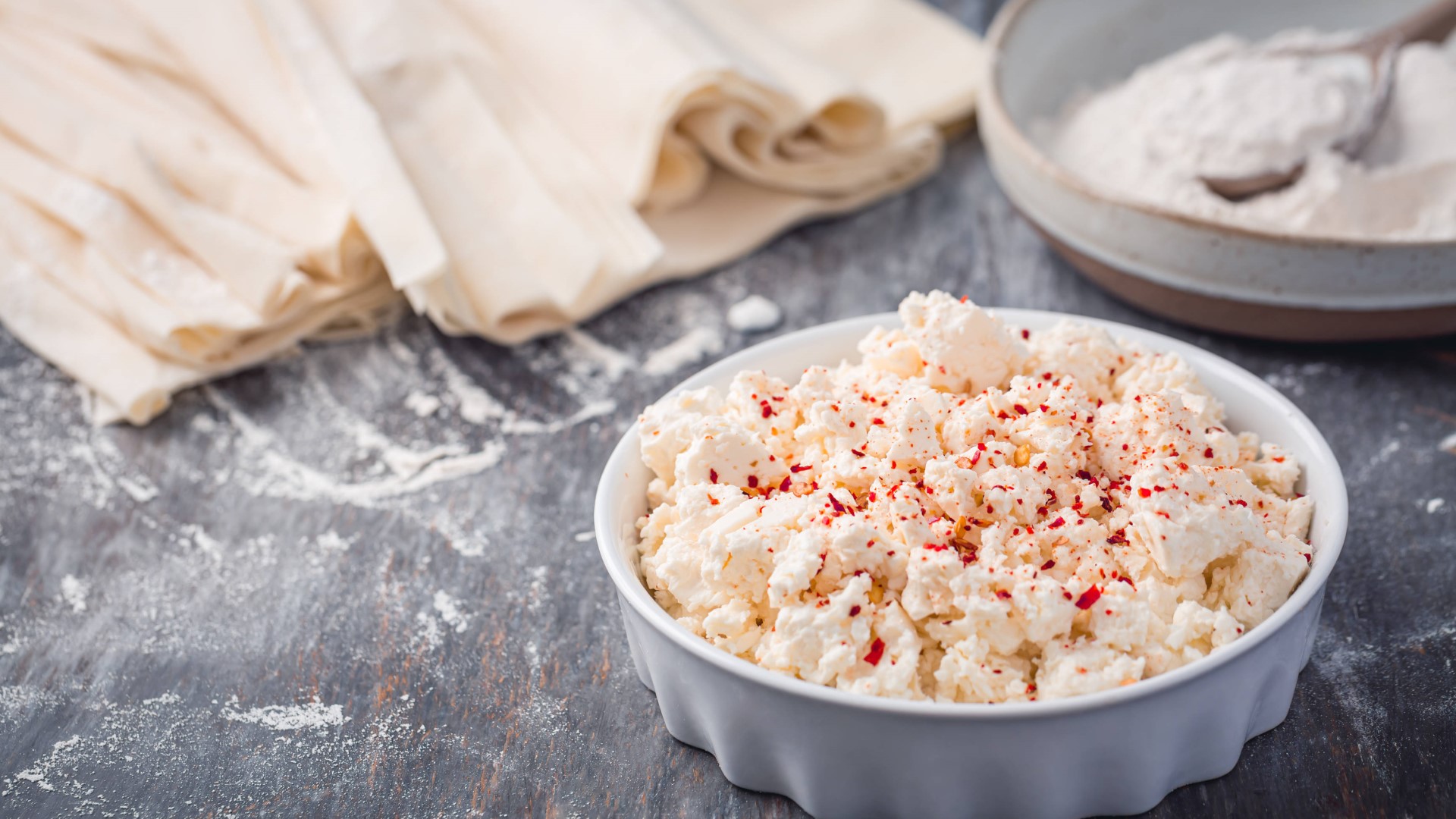 Смешайте творог с молоком, добавьте соль, сахар и влейте растительное масло. Пробейте смесь блендером до однородной консистенции. После этого введите муку и разрыхлитель.