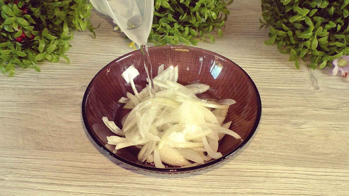 Первым делом следует замариновать лук. Для этого одну луковицу нужно нарезать и тщательно смешать с солью, сахаром и уксусом. Залить холодной водой, перемешать и оставить на время, чтобы он настоялся.