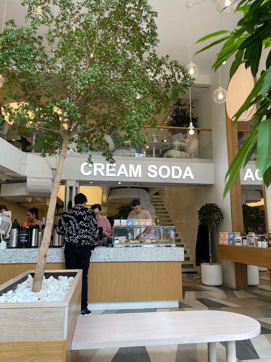 «Крем сода» удивляет с первого взгляда. Интерьер оформлен в светлых тонах с панорамными окнами, наполняющими пространство естественным светом. В этом уютном месте можно легко расслабиться за столиком, сделанным из натурального камня, и насладиться поистине уникальным дизайном.