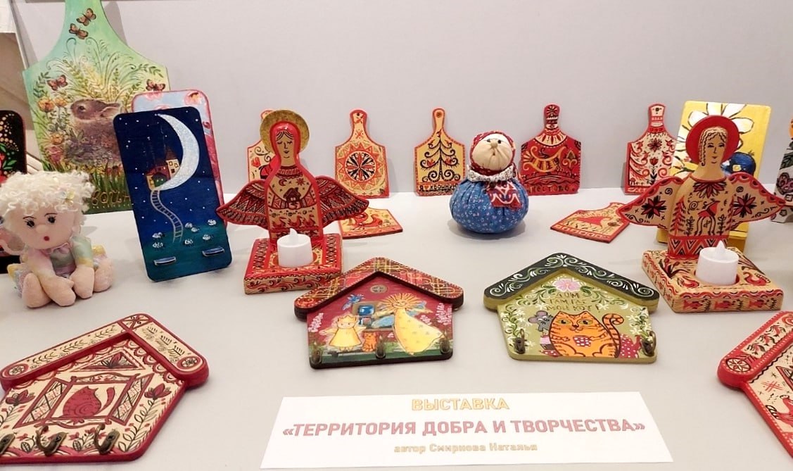 На второй выставке «Территория добра и творчества» (0+) можно полюбоваться изделиями рукодельницы Натальи Смирновой: расписными подставками под телефон, ключницами, сувенирными досочками-магнитами.