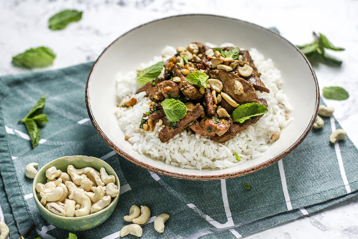 На раскаленной сковороде с добавлением столовой ложки растительного масла обжариваются кусочки свинины по 7-9 минут до золотистой корочки. Затем вливается настойка соусов, добавляются половина кешью и измельченные травы. Блюдо прогревается еще пару минут, после чего его накрывают крышкой и оставляют настояться.