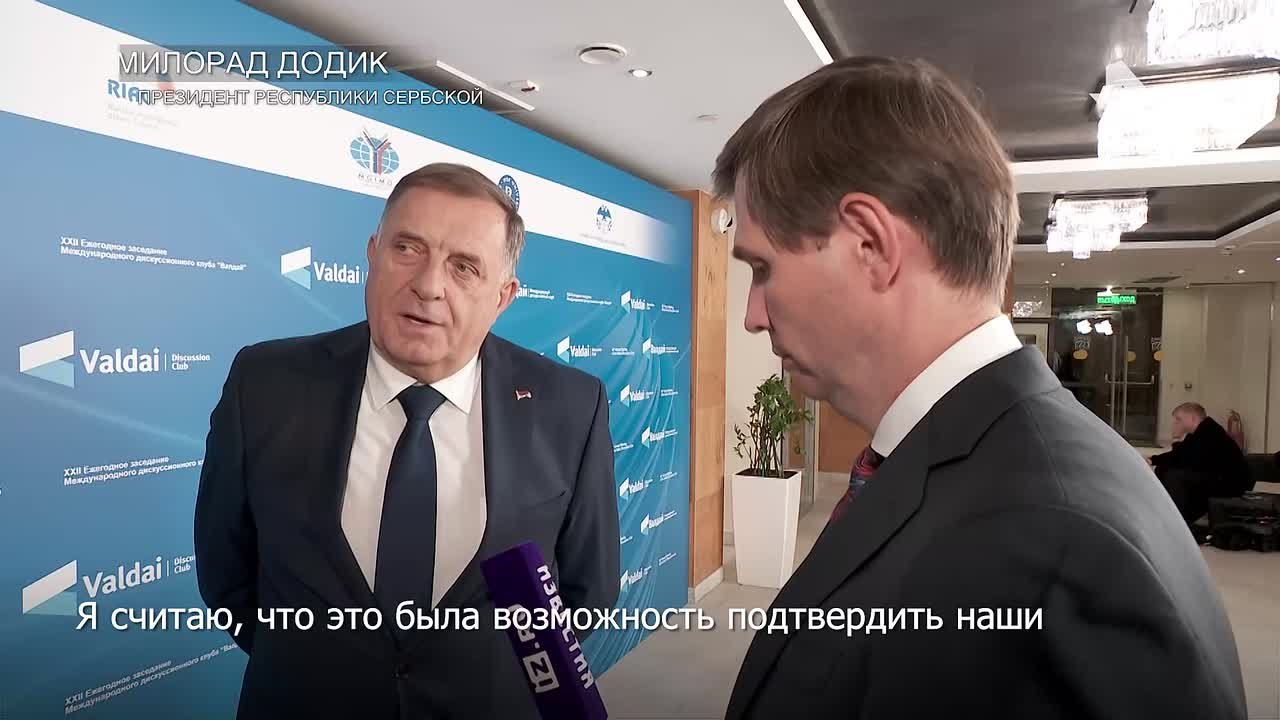 Ранее по окончании заседания Международного дискуссионного клуба "Валдай" Владимир Путин провел встречу с президентом Республики Сербской Милорадом Додиком.