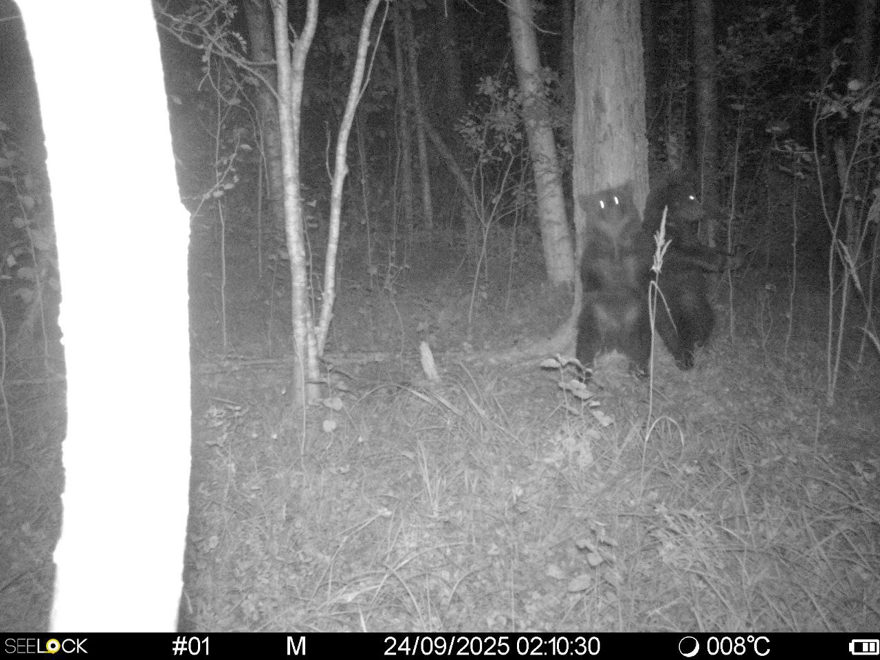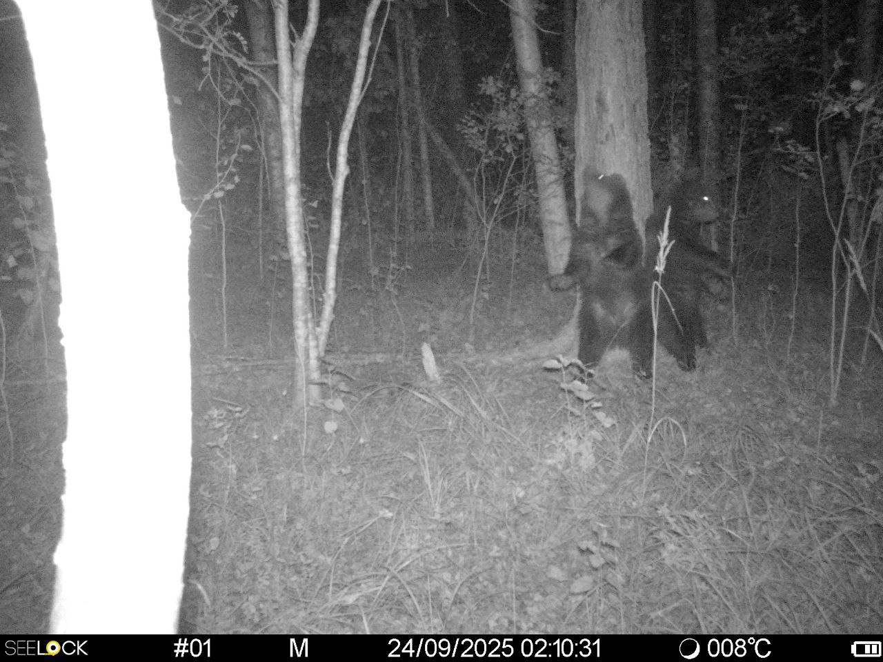 24 сентября в фотоловушку Рдейского заповедника «попалось» семейство медведей – медведица с двумя медвежатами. Она остановилась у маркировочного дерева и оставила свой «автограф» – потерлась о кору, оставляя шерсть и свой запах. Повторяя за матерью, и медвежата вдвоём потерлись спинами о кору. Так детёныши учатся маркировочному поведению.
