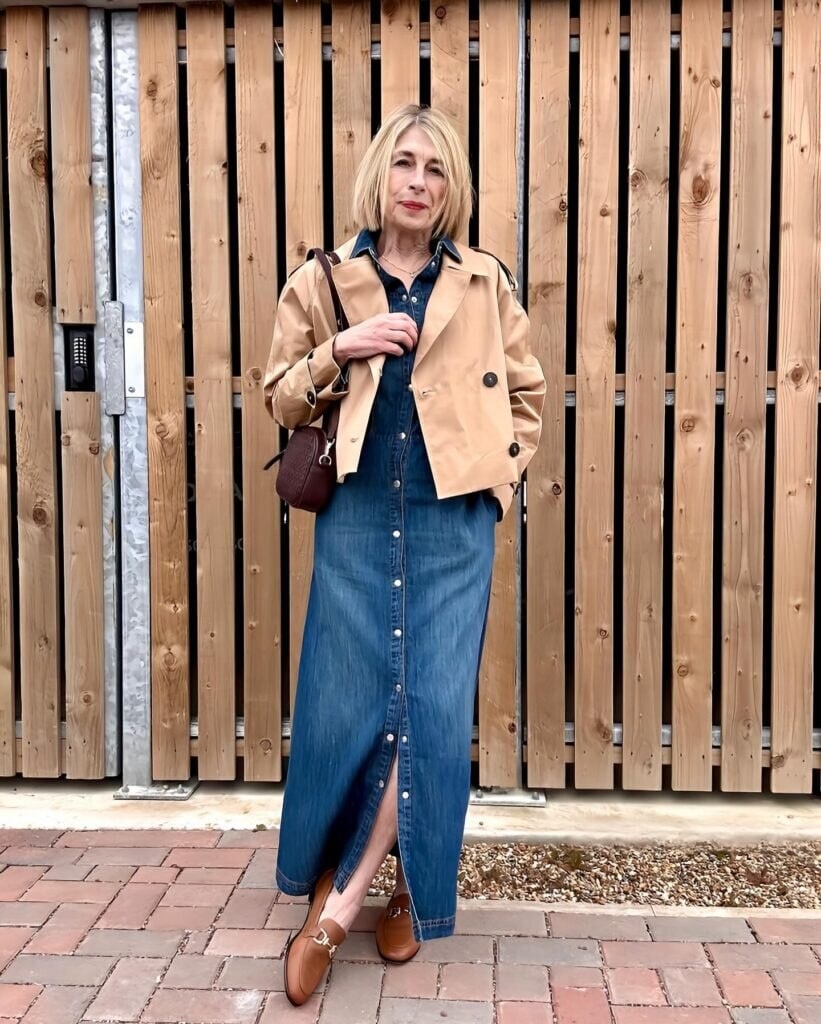 - Джинсовое платье макси с прямым кроем станет отличным вариантом для повседневной жизни. Пара кнопок может быть расстёгнута для удобства. Дополнить образ поможет бежевый укороченный плащ-тренч, а коричневые лоферы отлично завершат ансамбль, который дополнит стильная сумочка через плечо.