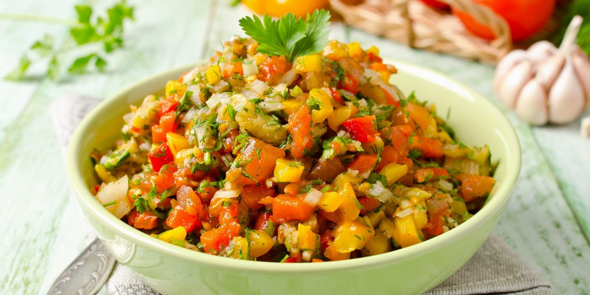 Овощи тщательно промываются и нарезаются: баклажаны и кабачки — кружками толщиной примерно 1 см, болгарские перцы — полосками, помидоры — крупными дольками, лук — кольцами, а чеснок — тонкими ломтиками.