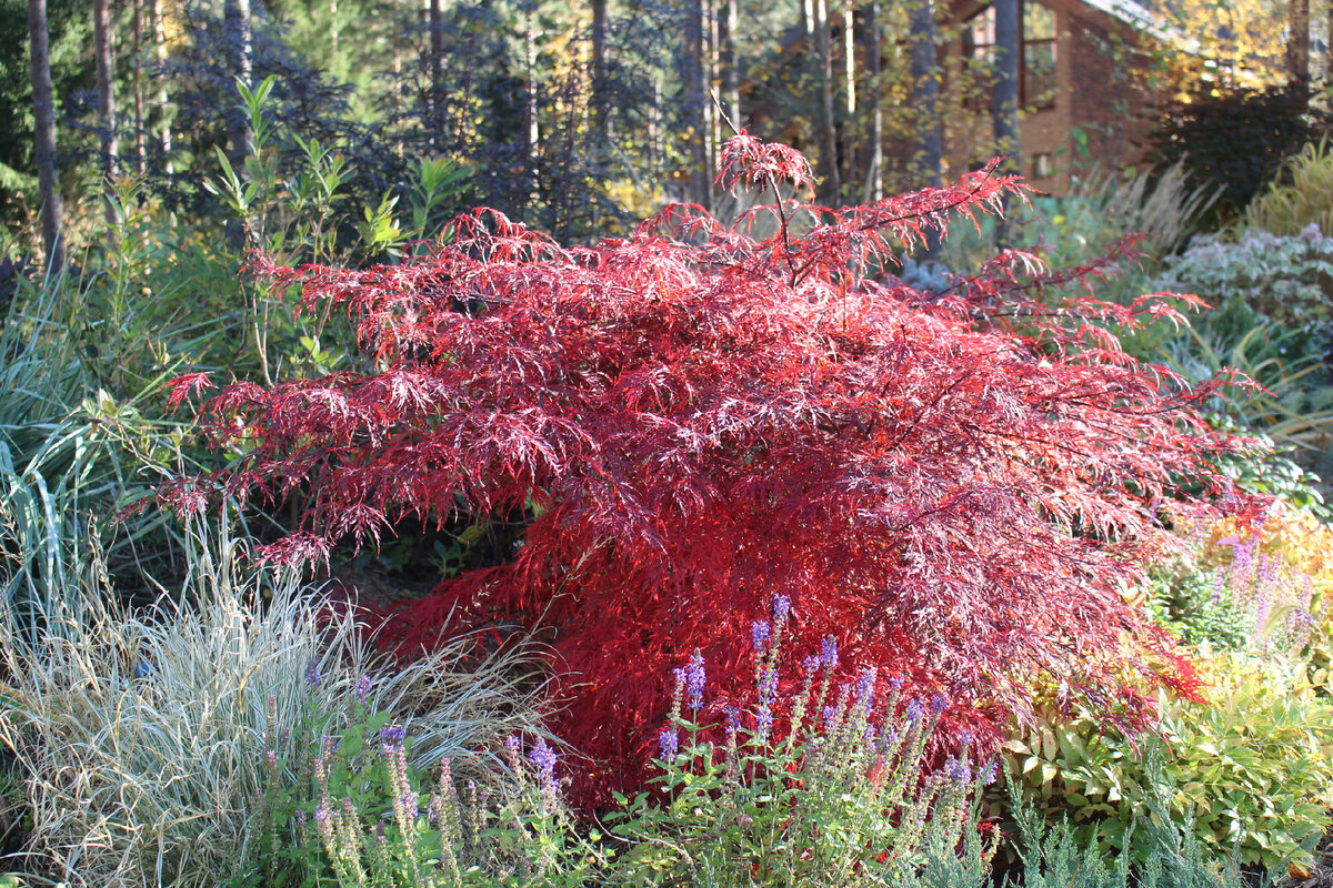 В начале октября сад расцветает особой красотой, когда дланевидные клены (Acer palmatum) радуют глаз не только своей формой, но и насыщенными оттенками листвы. Эти деревья, как никакие другие, раскрывают весь спектр осенней палитры, превращая сад в настоящий живой холст.