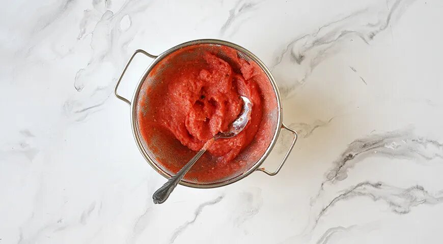 Перед началом работы овощи следует тщательно промыть. Помидоры нужно нарезать на произвольные кусочки, удалить плодоножки и измельчить блендером до состояния пюре. Полученное пюре рекомендуется пропустить через сито или марлю для отделения твердых частиц.