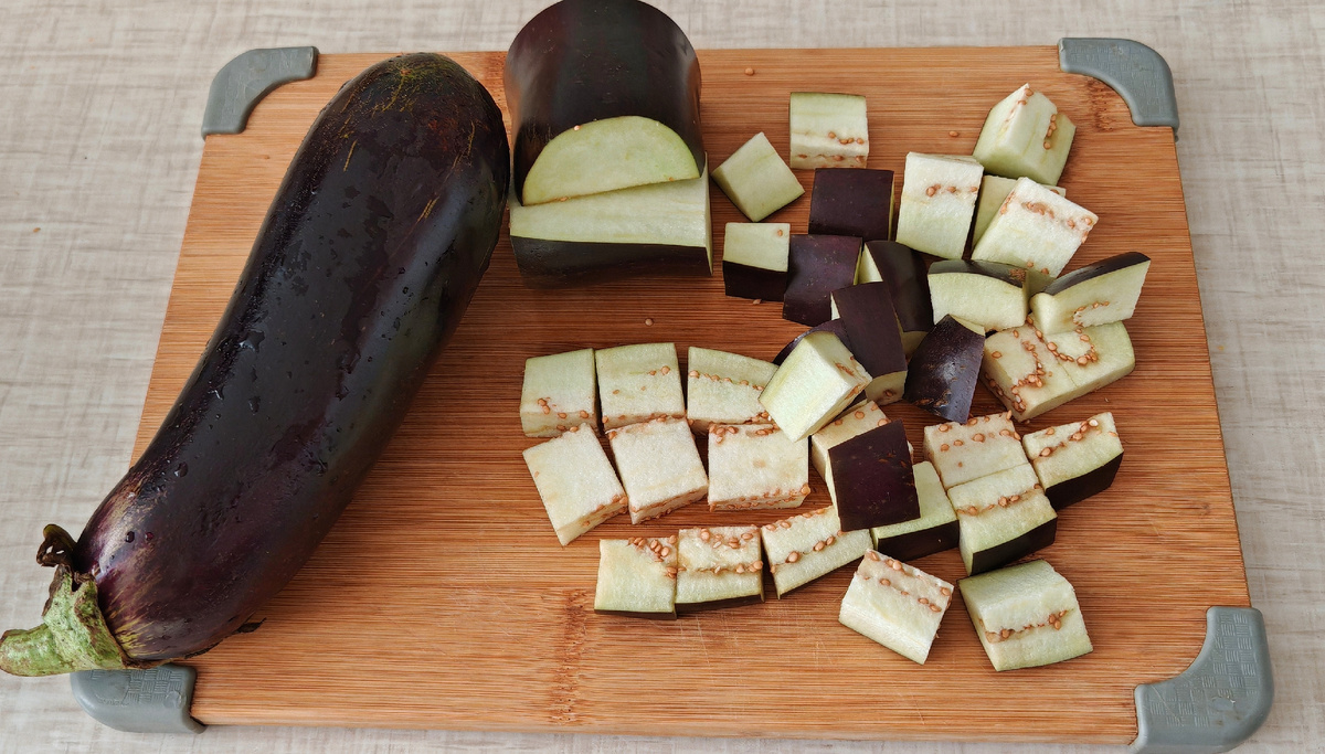 Для начала стоит тщательно вымыть баклажаны и нарезать их кубиками. Затем их следует слегка посолить и оставить постоять на 15 минут. В этот момент жидкость, которая выделится, только улучшит вкус будущего блюда. После этого помидоры нарезают на крупные дольки (меньшие можно разделить пополам) и также подготавливают.