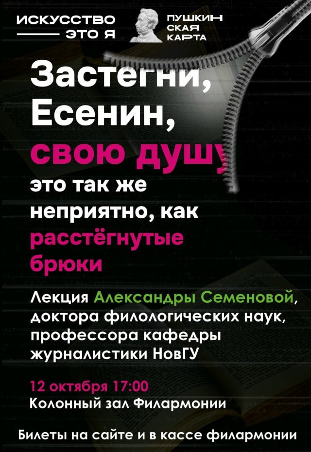 В воскресенье, 12 октября, в 17:00 в Колонном зале Новгородской областной филармонии имени Аренского состоится лекция «Застегни, Есенин, свою душу». Об этом сообщили в ВК-сообществе Театра драмы имени Достоевского.