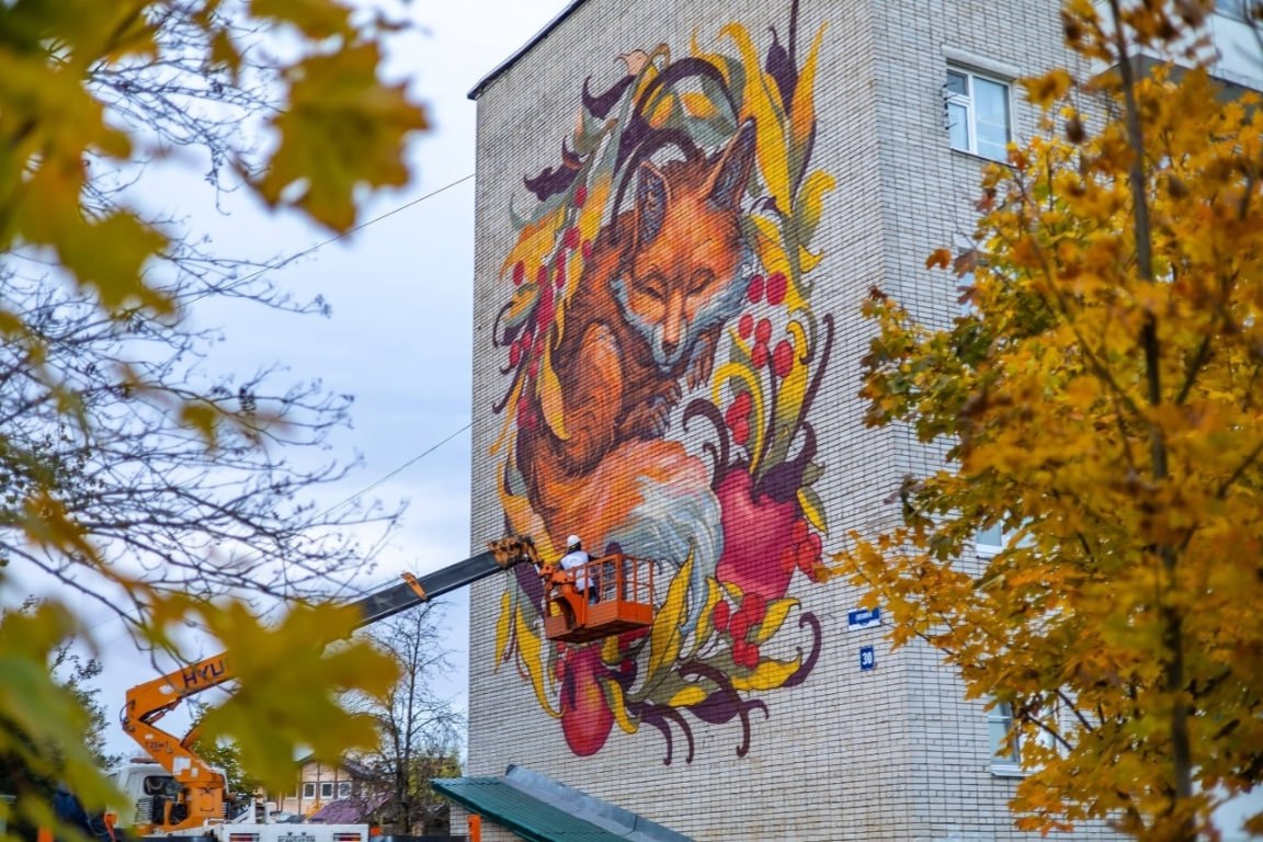 Серую стену здания в Валдае украсило уютное изображение спящей лисы