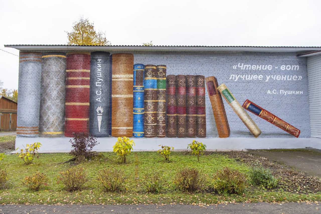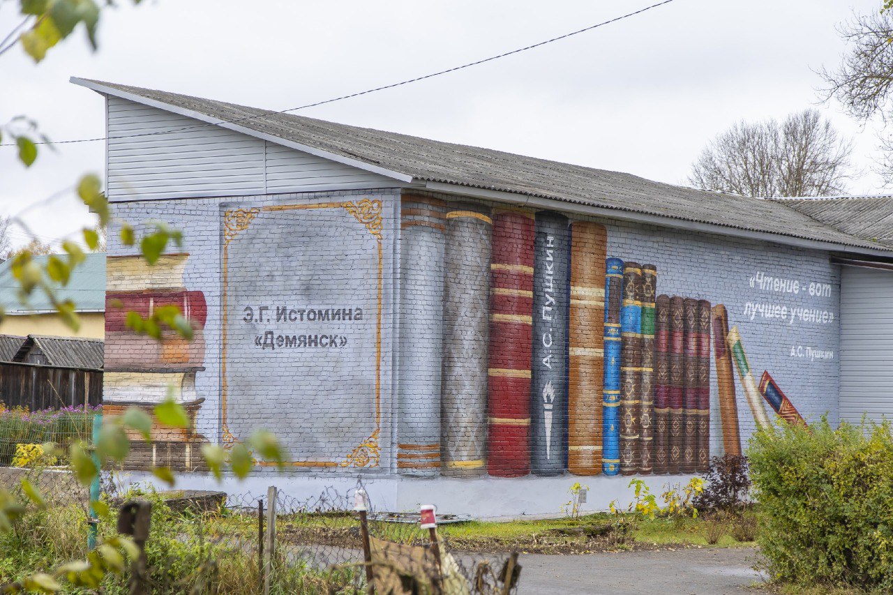 На фасаде библиотеки в Демянске появился мурал с книжной полкой