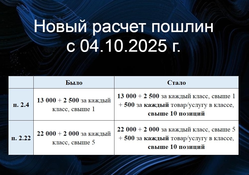 Особое внимание следует уделить изменениям в подходах к расчёту пошлин. Теперь расчет включает не только количество классов Международной классификации товаров и услуг (МКТУ), но также учитывает количество наименований товаров и услуг.