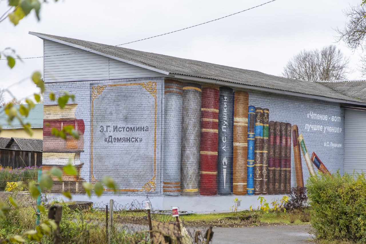 На фасаде библиотеки в Демянске появился мурал с книжной полкой