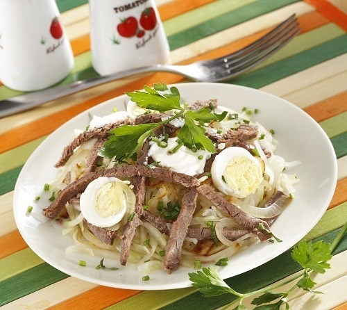 Готовый салат разложить по тарелкам, полить сметаной и посыпать свежей петрушкой. В качестве украшения использовать несколько полосок мяса и кружочков яиц.