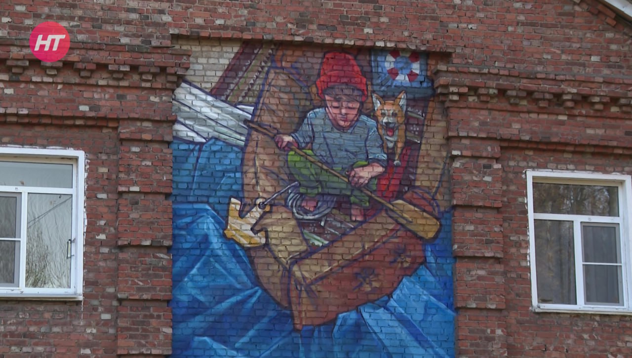 Новый рисунок на доме по улице Парковой посвящен истории боровичских лоцманов, покорявших бурные пороги Мсты. Автор изобразил мальчика, который бесстрашно преодолевает препятствия на импровизированной лодке.