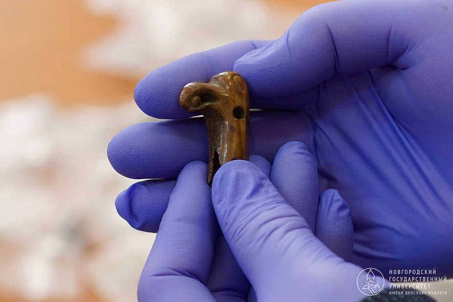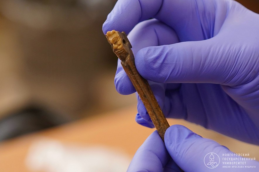 «В верхней части предмета мы видим тонкую, сложную резьбу. С одной стороны вырезана некая «личина», то есть лицо. С другой стороны — стилизованное изображение зверя с раскрытой пастью.Получается как будто голова человека в пасти зверя. Символику этого изображения ещё предстоит выяснить искусствоведам. Мы можем предположить здесь отсылки к романскому стилю — возможно, вещь попала в Руссу из Европы. И для Старой Руссы, и для Великого Новгорода эта находка уникальна», – пояснил директор Центра археологических исследований НовГУ Сергей Торопов.