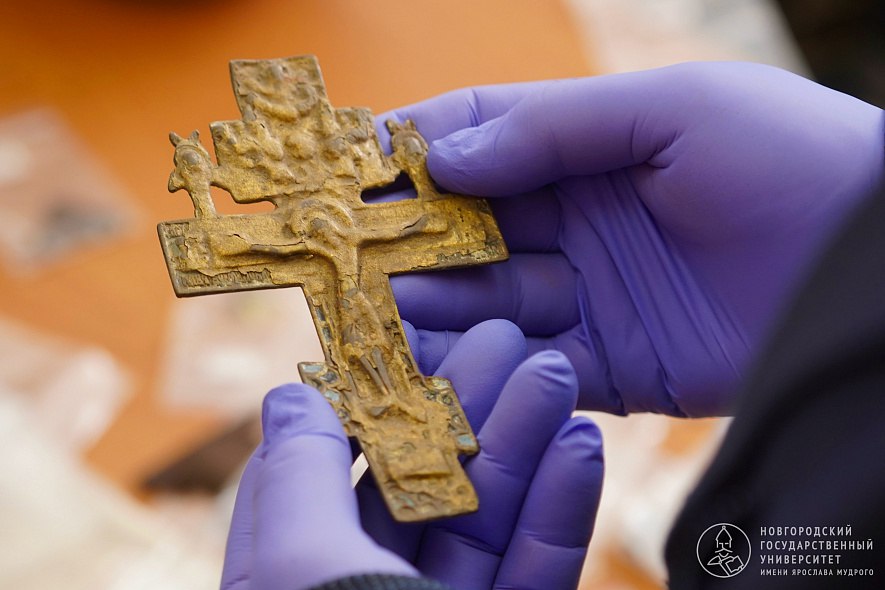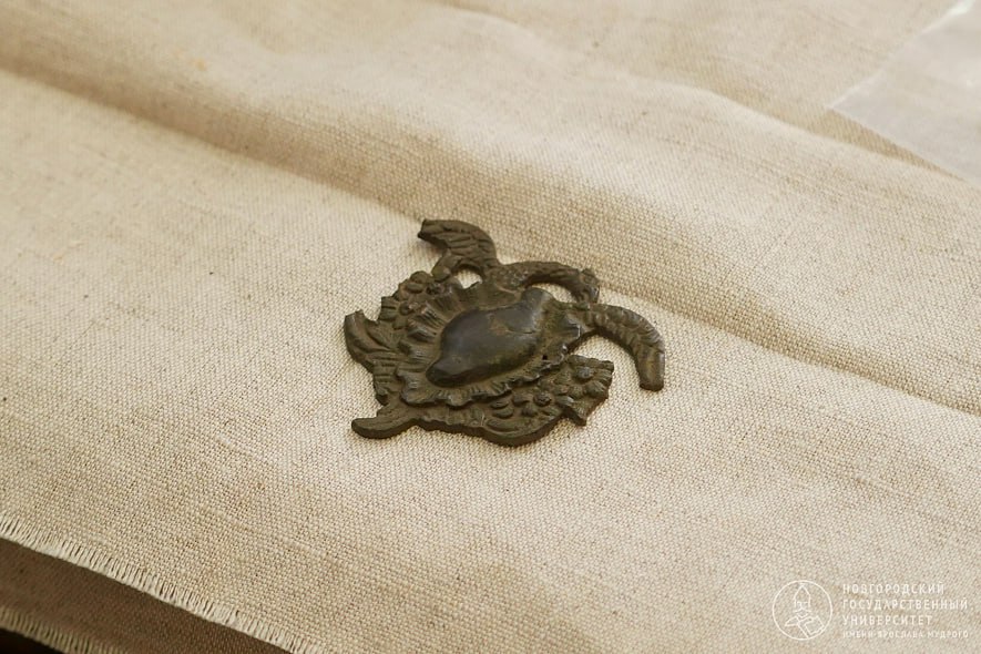 «Находки здесь — из поздних слоёв, предположительно XIX — начала ХХ века. Например, довольно крупный наперсный крест — деталь облачения священнослужителей. Он немного погнут, но в целом в хорошей сохранности. Изначально это была довольно яркая вещь, покрытая цветной эмалью.Но в какой-то момент крест решили подновить и покрыли бронзовой краской. Здесь же был обнаружен любопытный нашивной металлический жетон с изображением пеликана, кормящего птенцов своим сердцем. Со времён раннего христианства он был символом самоотверженности и жертвенной любви. Во времена Российской империи эта эмблема использовалась благотворительными учреждениями», – отметил Сергей Торопов.