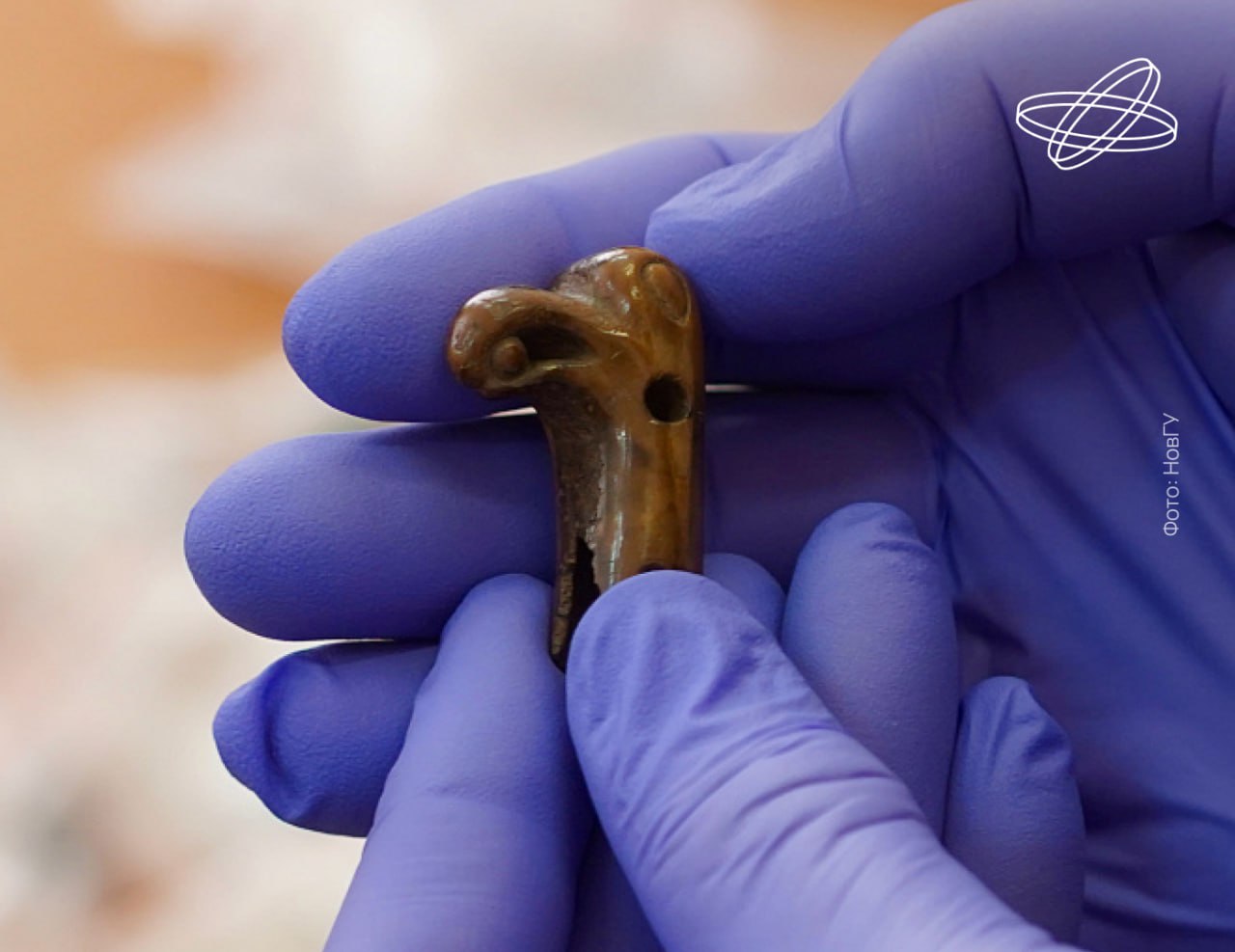 Вторая находка из моржового клыка представляет собой отполированное навершие плётки, вырезанное в виде птичьей головы. Такие вещи встречаются на Новгородчине довольно редко, констатировали специалисты Центра археологических исследований НовГУ.