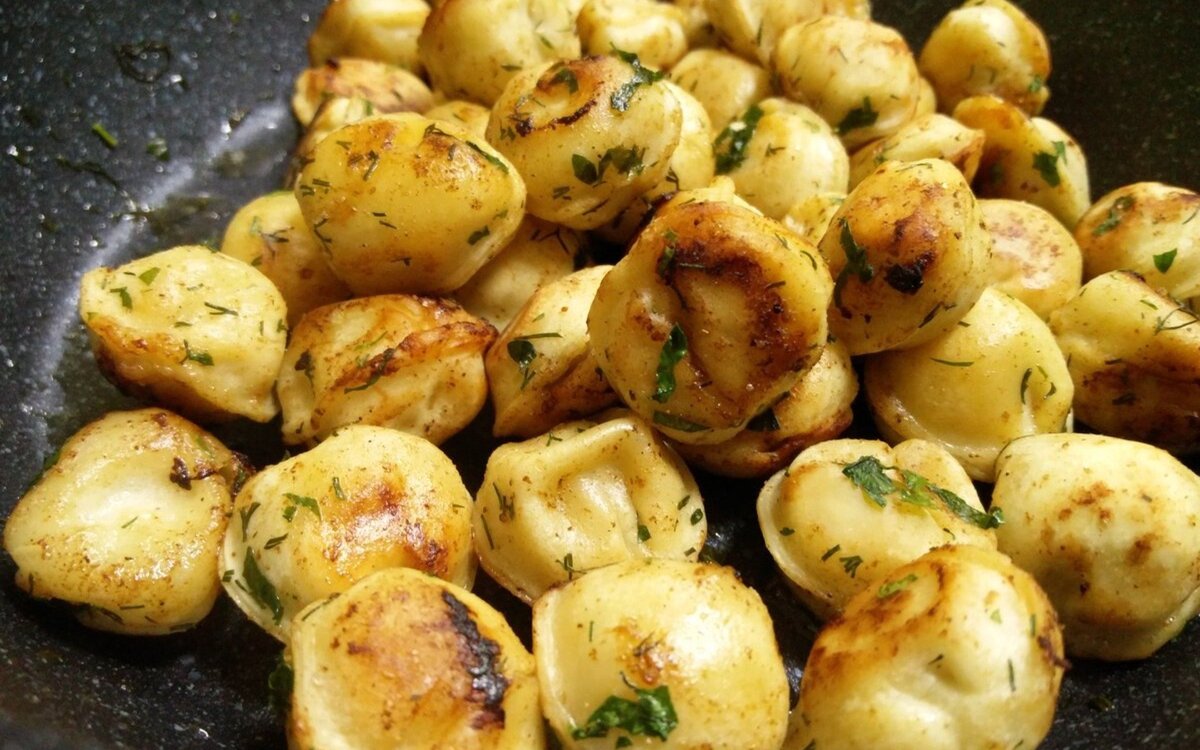 После этого добавляется немного воды или бульона, чтобы они были покрыты примерно на одну треть. Затем огонь уменьшается, и сковороду накрывают крышкой. Через несколько минут вода испаряется, и жареные пельмени готовы к подаче на стол.