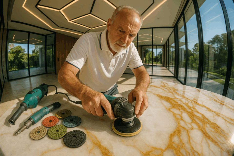 - Профессиональная полировка. Это наиболее эффективный способ вернуть столешнице ее яркость и глубину цвета. Технология включает в себя шлифовку и полировку с использованием специальных средств.