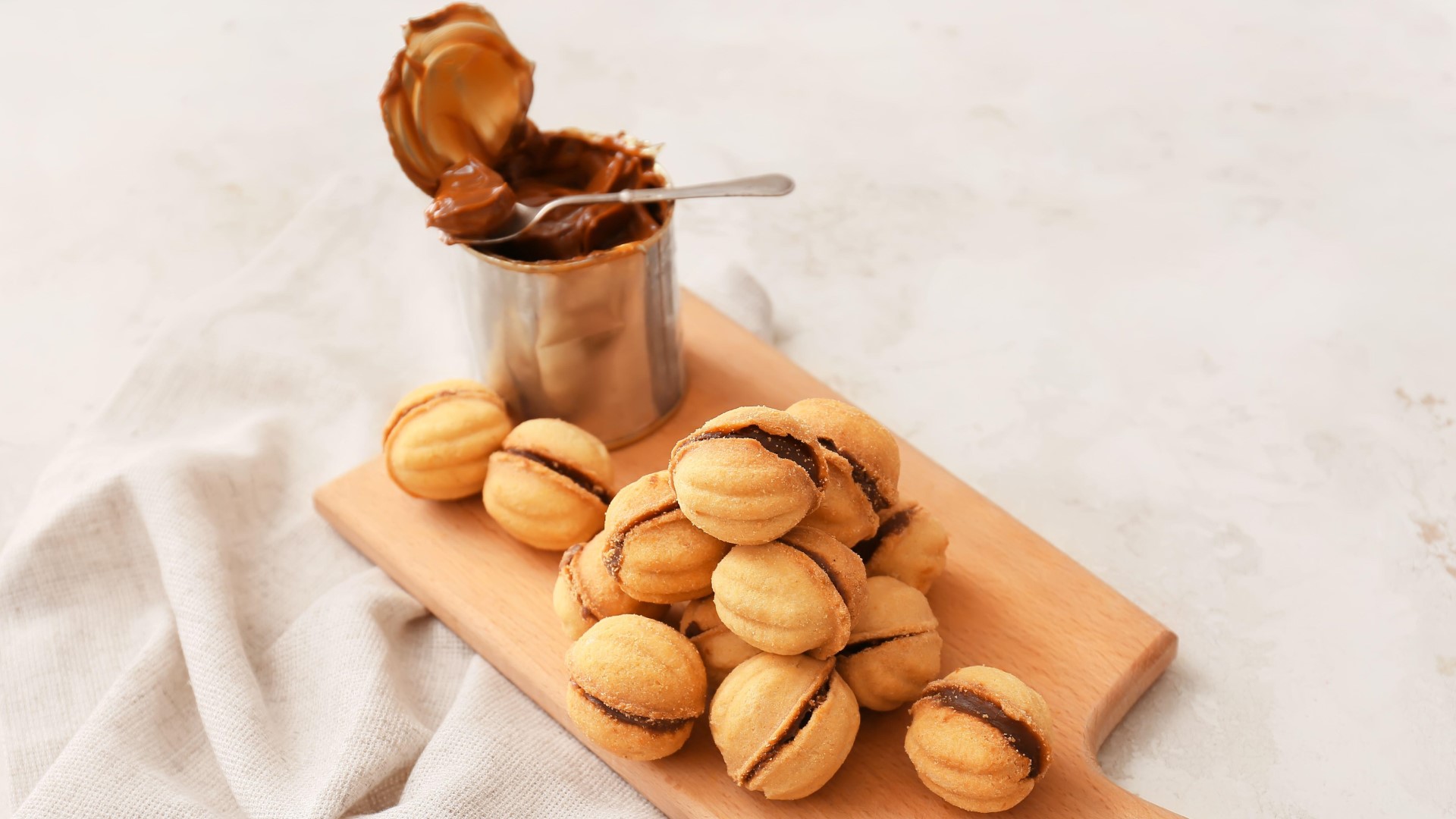 Раскатайте тесто и вырежьте небольшие кружки. Из пищевой фольги сформируйте «пенечки» с округлым верхом и выложите на них заготовку, сделав из массы половинку «орешка». Выпекайте десерт при температуре 170 градусов. А после начините печенье сгущенкой и соедините две части лакомства, советует дзен-канал «PripravaClub — кулинарный канал».