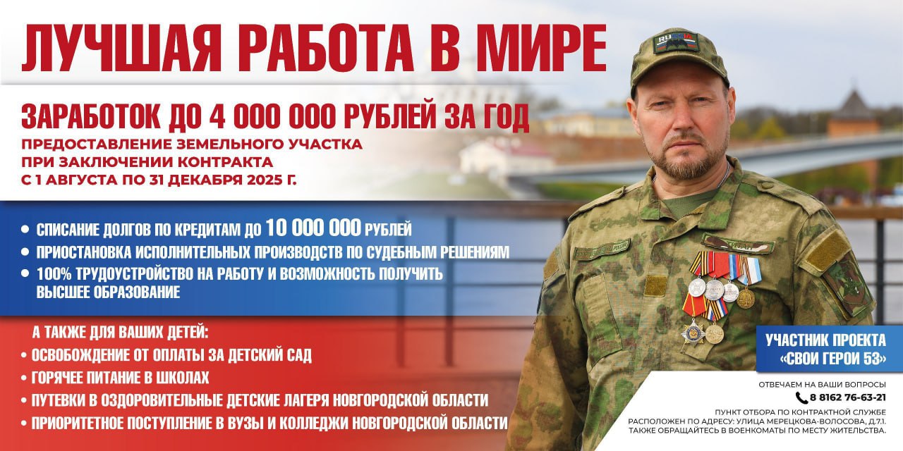 До 4 миллионов рублей за год при заключении контракта с Минобороны РФ. С 1 августа по 31 декабря 2025 года предоставляется земельный участок.