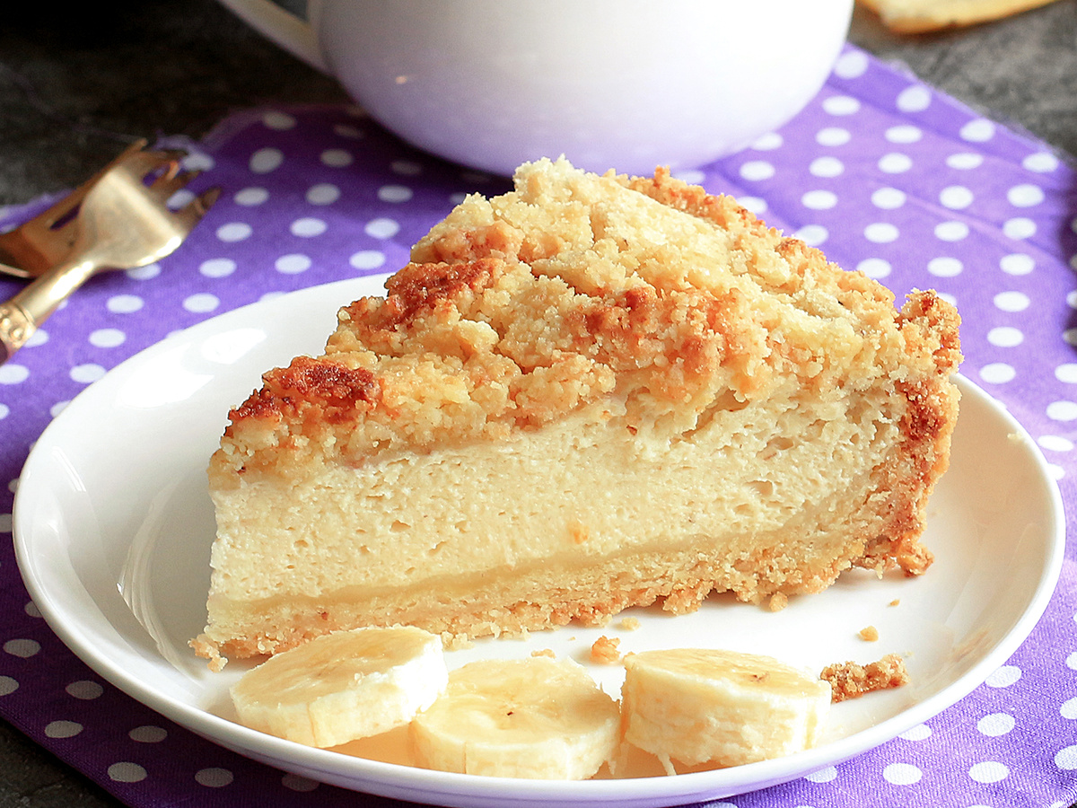 Форма диаметром 20 см готовится к использованию — её застилают бумагой для выпечки или смазывают и посыпают мукой. На дно высыпают половину крошки и утрамбовывают, формируя бортики. Затем заливается творожная масса, состоящая из 400 г творога, 60 г сахара, 2 яиц и одного спелого банана, добавимого в виде пюре. Все это нужно тщательно перемешать до однородной консистенции.