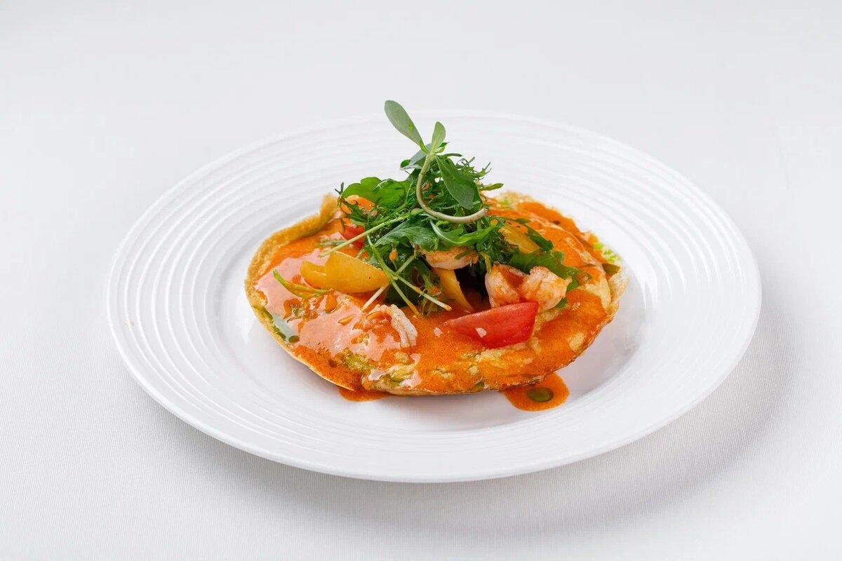 4. Подача: Когда омлет готов, осторожно перенесите его на тарелку. В соус биск добавьте сливки и мелко нарезанные бланшированные томаты. Полейте омлет соусом, украсьте жареными креветками и миксом салата.