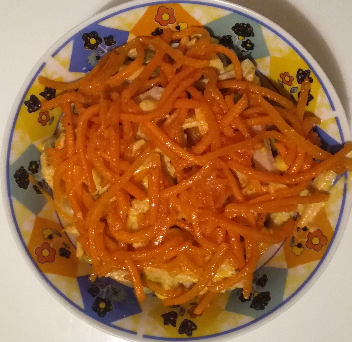 Вариант 3: Вместо ветчины используем 200-250 г отварного мяса (говядины, свинины или куриного филе). Мясо нужно отварить, нарезать и добавить к моркови, горошку и кукурузе, заправив все майонезом и перемешав.