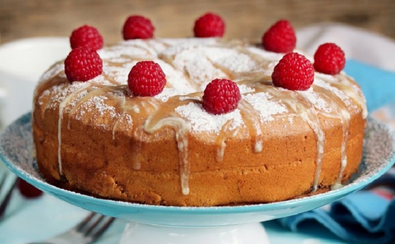 - Выпекайте: Вылейте тесто в форму, расклыйте малину сверху, затем поставьте в разогретую до 180 °C духовку на 40 минут. Проверьте готовность с помощью деревянной шпажки.