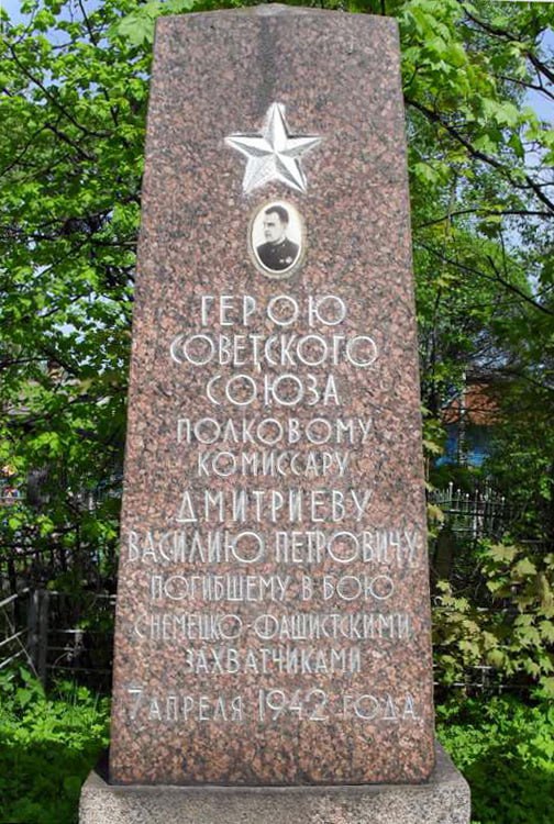 7 апреля 1942 года мощный вражеский контрудар пришелся на позиции 846-го стрелкового полка, в порядках которого в это время находился комиссар дивизии Василий Дмитриев. Атака немецкой пехоты поддерживалась сильным артиллерийским огнем. Противник подошёл к командному пункту полка на расстояние 30-40 метров. Дмитриев понимал, что остановить врага можно только немедленной контратакой, и сам поднял в нее бойцов. Положение удалось поправить, но Василий Петрович в этом бою погиб. Только на следующий день разведчики смогли вынести в поля боя его тело.