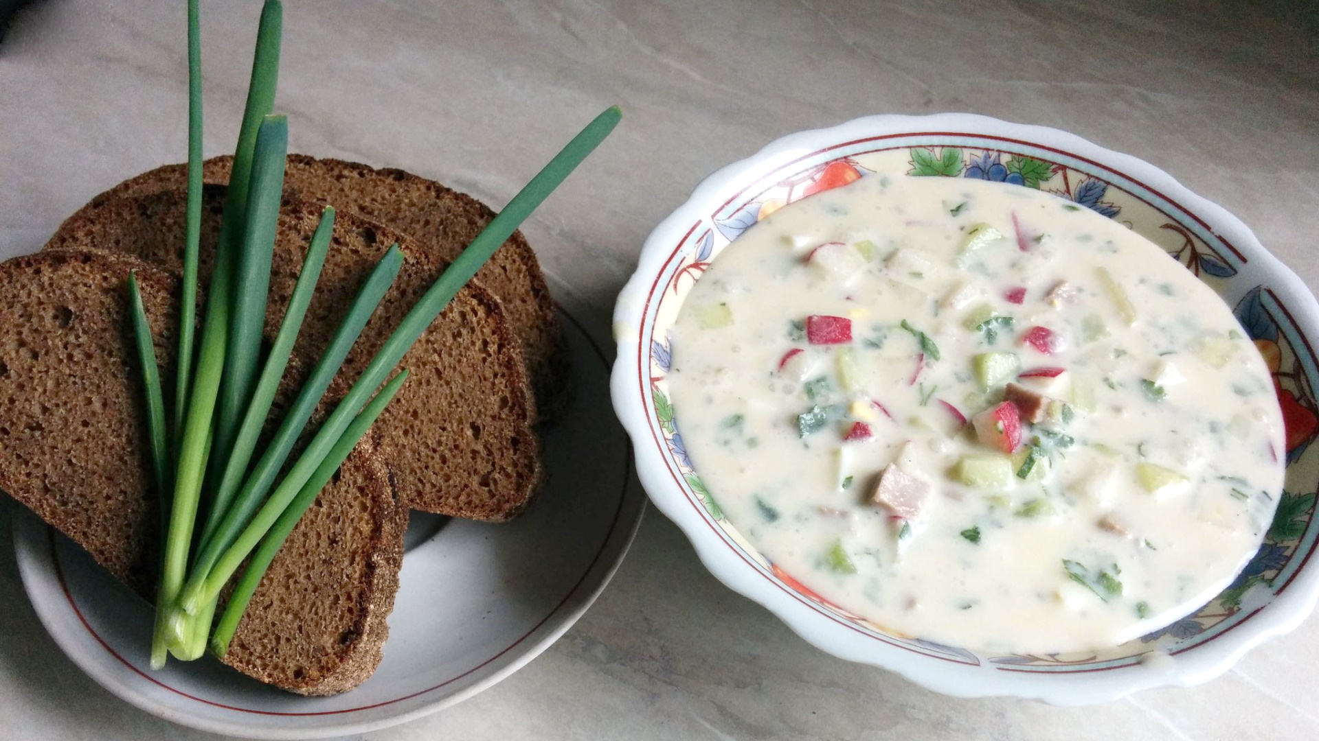 «Основные составляющие окрошки — это какой-то белок: колбаса, мясо, курица иногда даже рыба. Дальше идет редис, зеленый лук, огурец и яйцо.