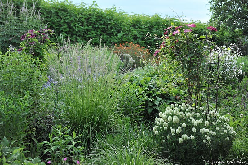 - К июлю освежающие цветы в увядании притягивают взгляды благодаря универсальным переходным тонам клематисов и декорациям соседствующих растений.